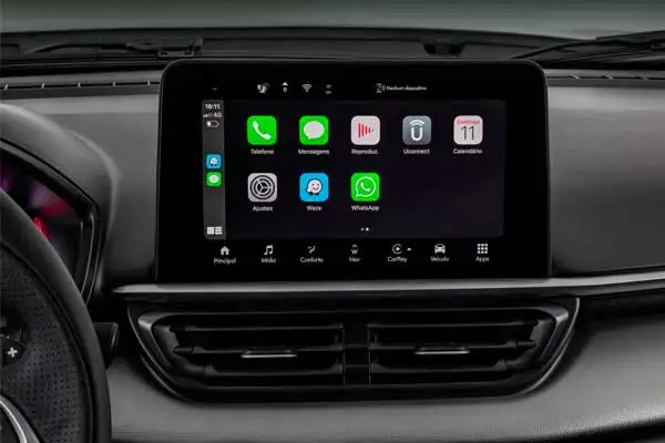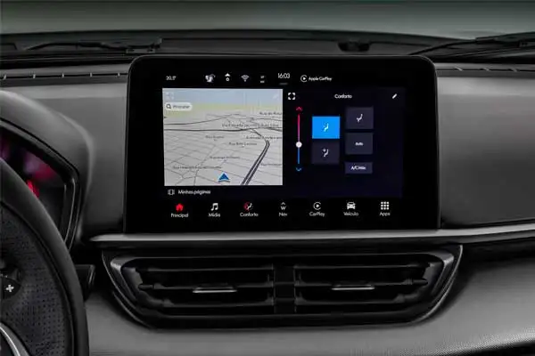 - Central multimídia com tela de 8,4" touchscreen, Apple Car Play e Android Auto wireless, Comandos de Voz, Bluetooth, MP3, Rádio AM/FM, Entrada Auxiliar, Porta USB (2): USB Tipo A e Tipo C.
