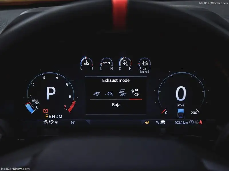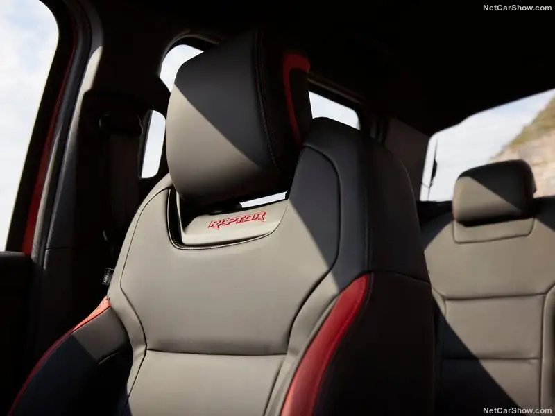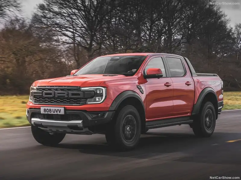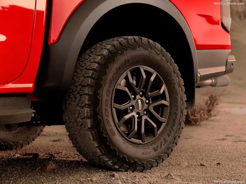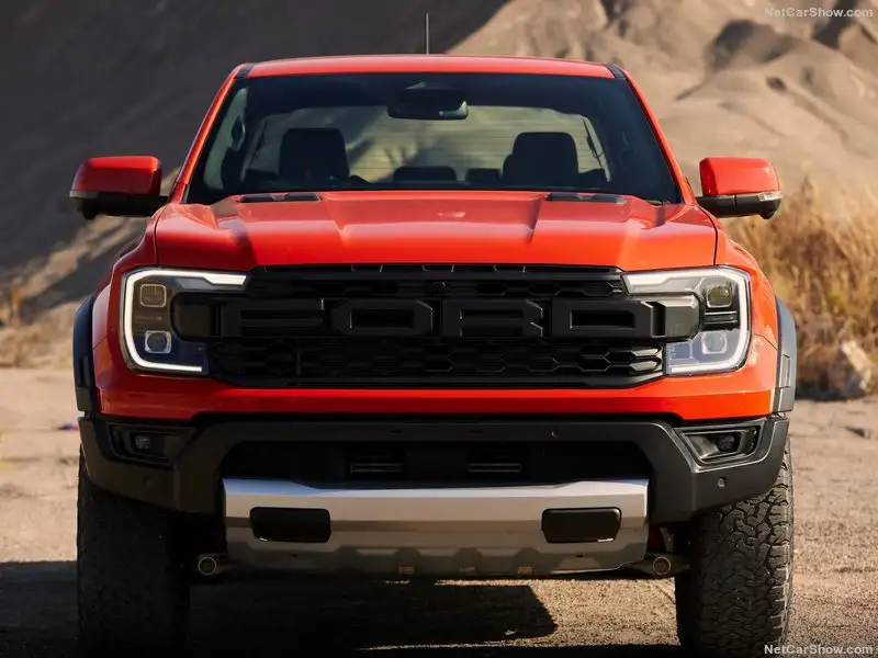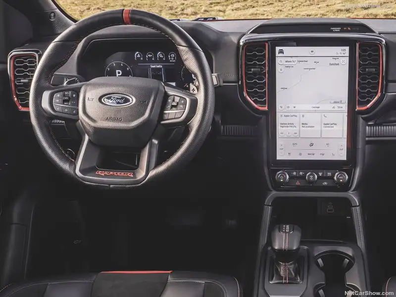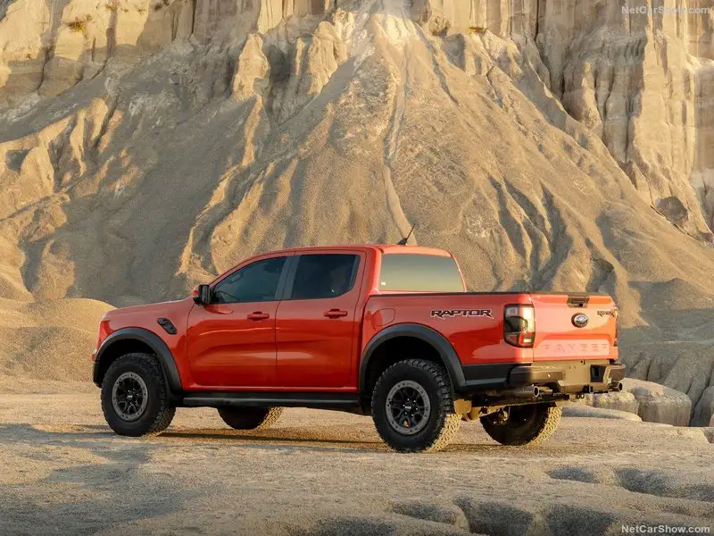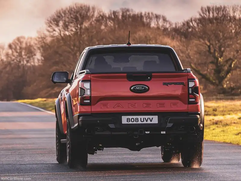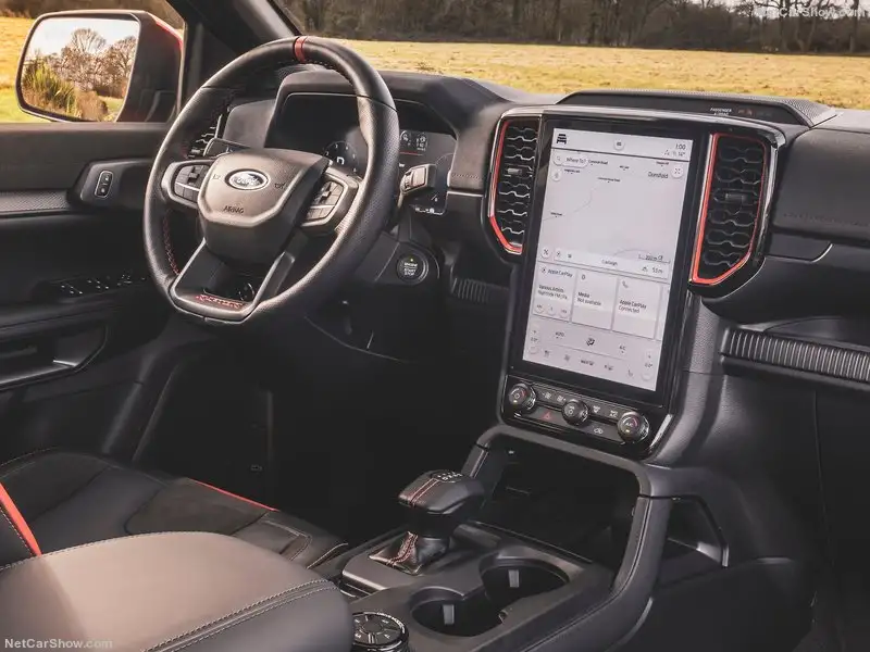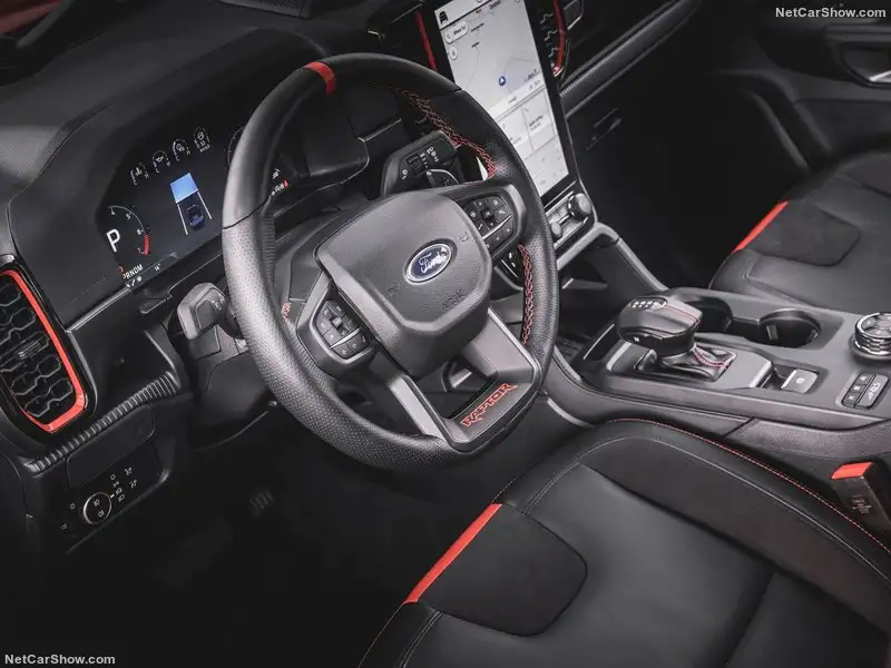 O visual da Ranger Raptor 2023 é reforçado pelo novo para-choque dianteiro, grade escurecida com o nome Ford por extenso, para-lamas alargados, estribos laterais, aberturas no capô, molduras ao redor das caixas de roda e rodas exclusivas de 17 polegadas com pneus off-road. Do lado de dentro, a picape traz bancos esportivos exclusivos, com detalhes em laranja.